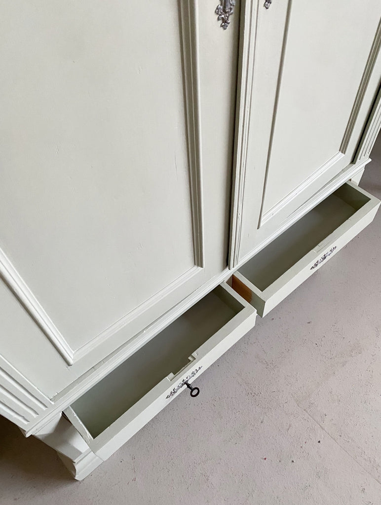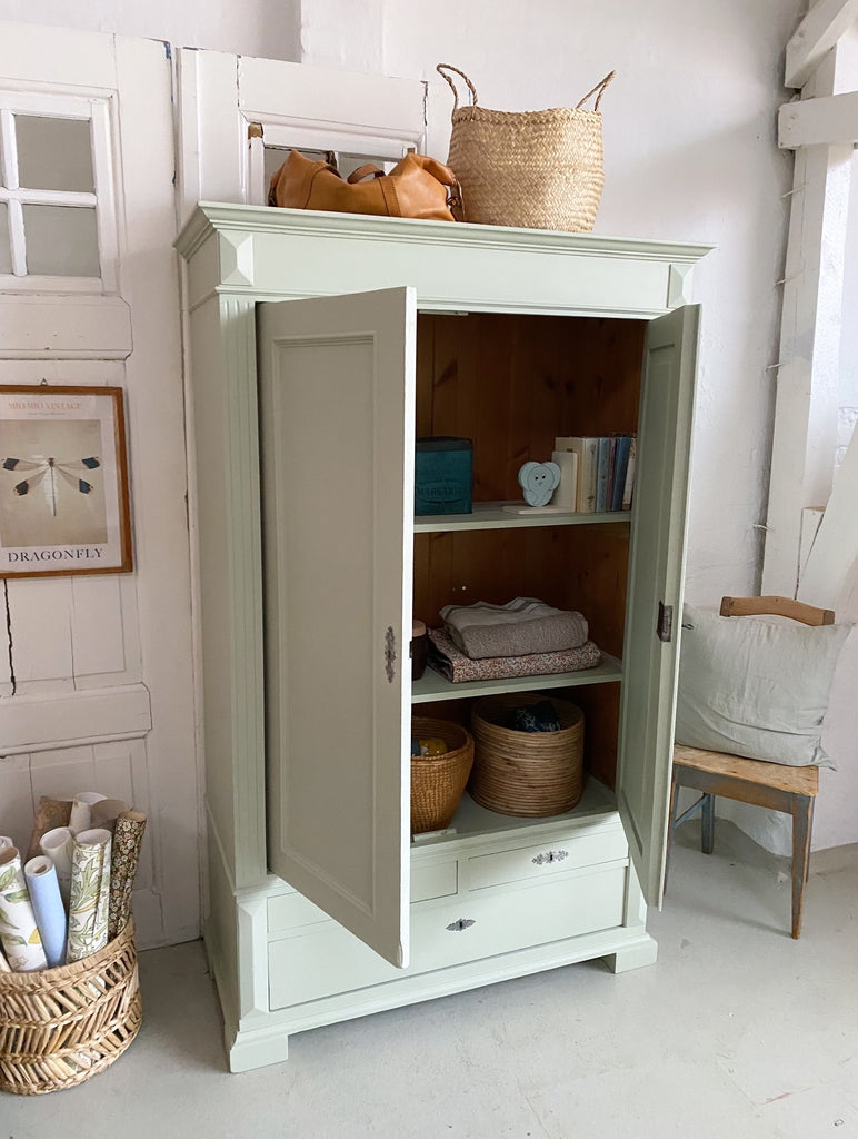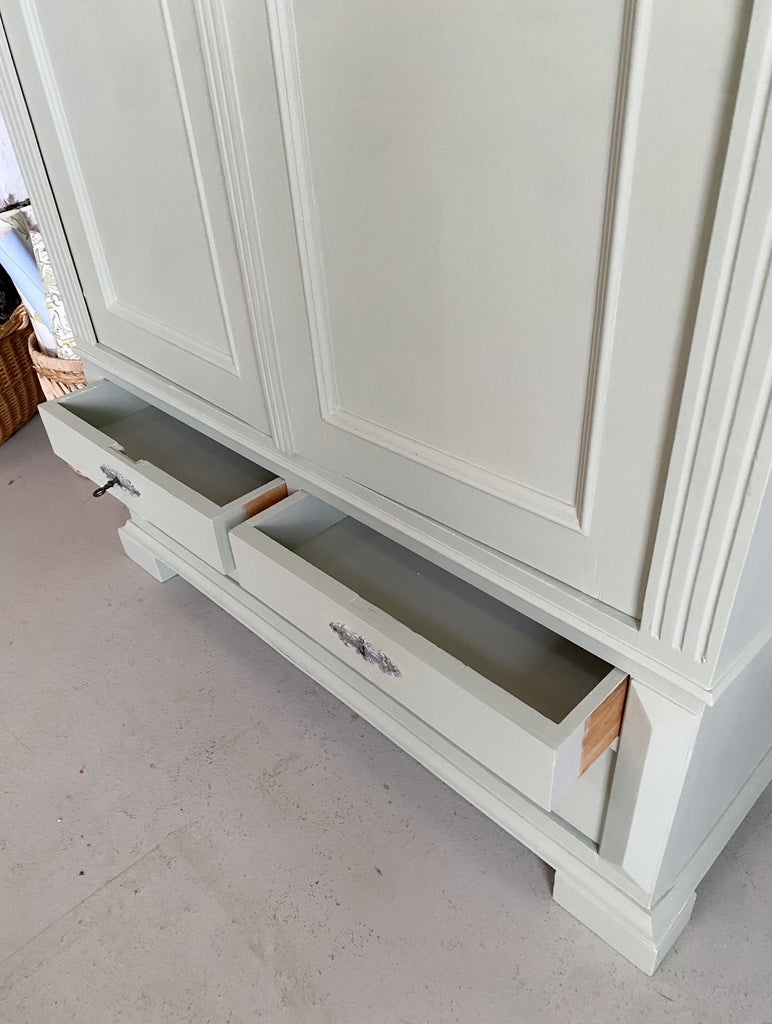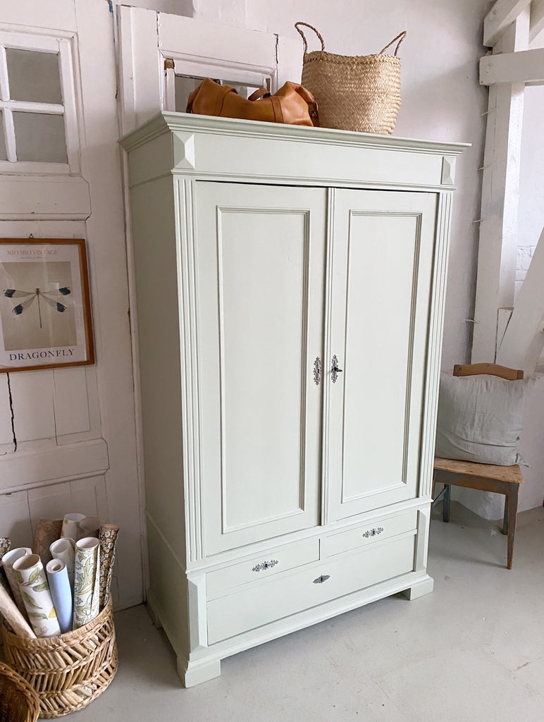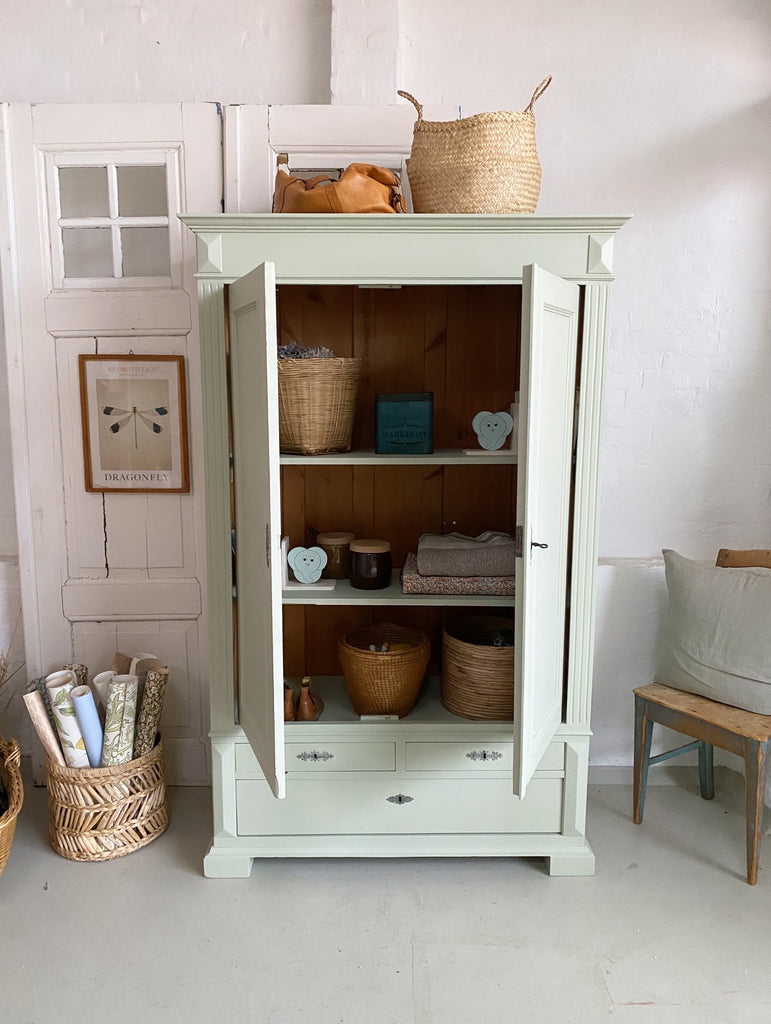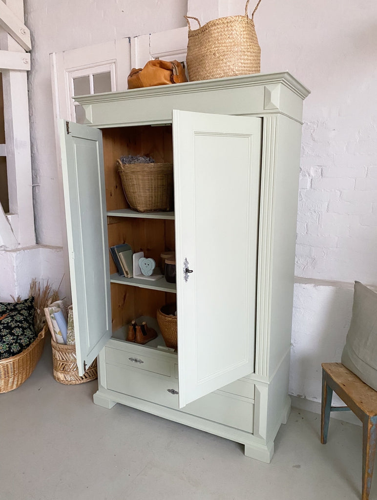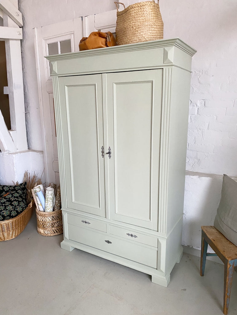 Smukt klassisk dobbeltdørs karlekammerskab i en lys og varm støvet grøn farve. Skabet er med originale messingbeslag og nøgle, to små skuffer og en stor skuffe i bunden. Skabet har også en fin bøjlestang og træhylder, og er med masse af praktisk opbevaringsplads.