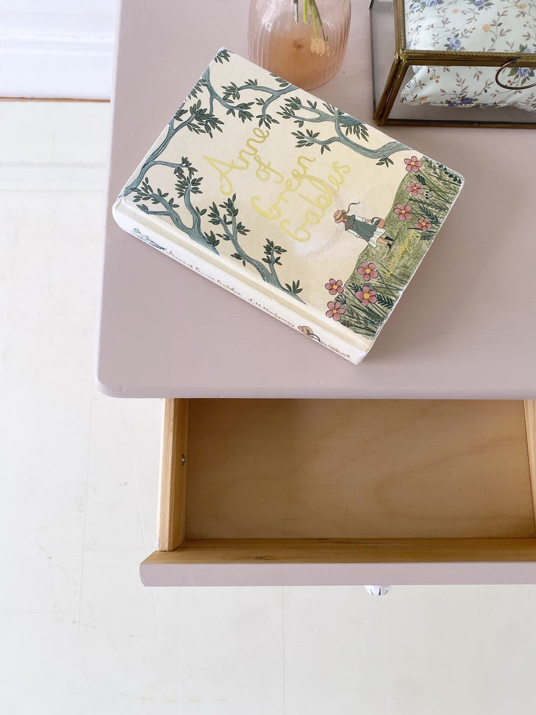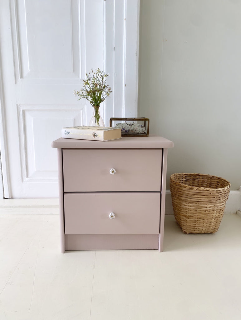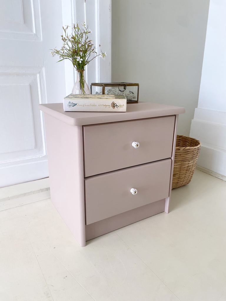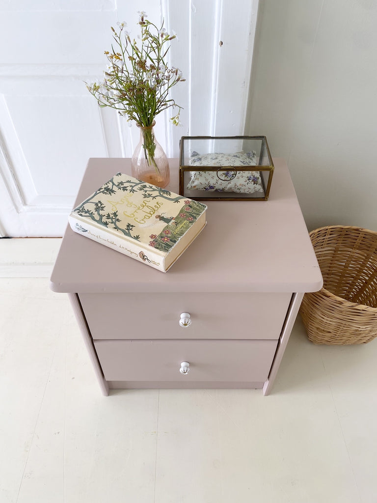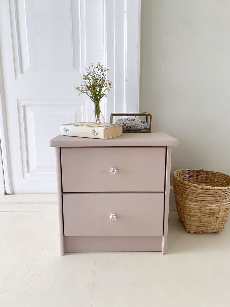 Sødt lille sengebord i den støvede gl.rosa farve, “Ella”, med to skuffer og nye håndmalede porcelænsgreb.